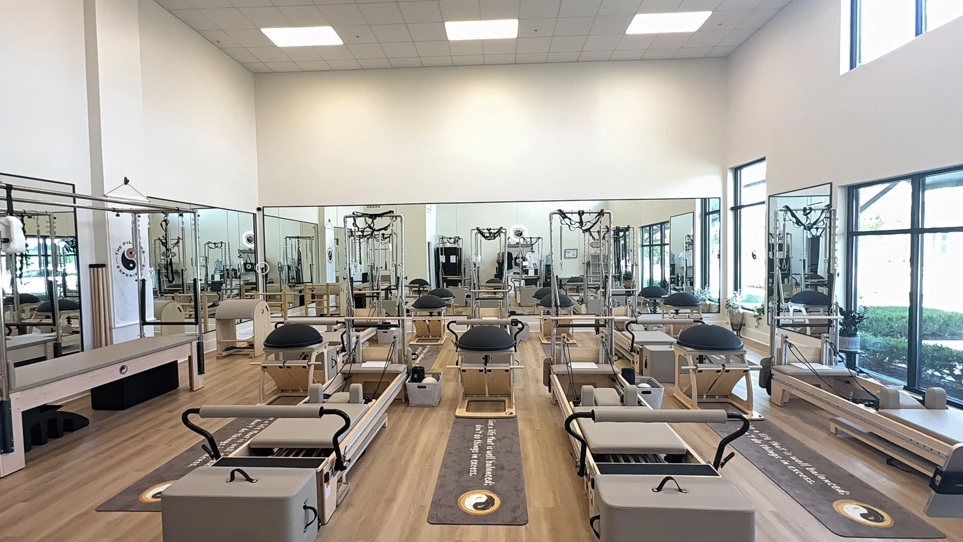 6 Half Trapeze Reformers w/ towers, push-thru and dowel bars, jump boards, and infinity foot bars allowing for a wider range of exercises & movement compared to standard studio reformers